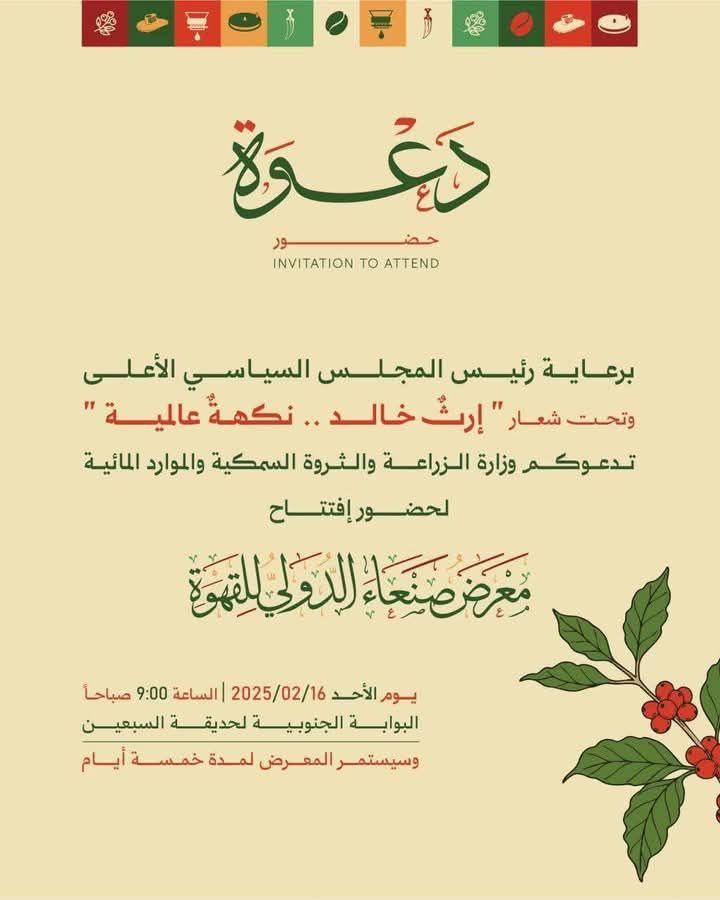 With the participation and sponsorship of the General Investment Authority (GIA), the 2025 Sana’a International Coffee Exhibition will kick off tomorrow, Sunday, February 16, in the capital, Sana’a, under the theme: