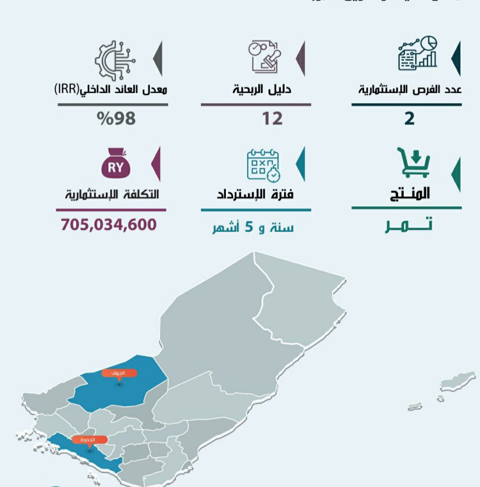 هذه الفرصة الاستثمارية ليست مجرد مشروع، بل بوابة اليمن إلى سوق التمور العالمية، ورافعة تنموية لمحافظات واعدة، فرصة استثمارية بتكلفة معقولة وعوائد سريعة، فهذا مشروع يجمع بين الربح والتأثير الاقتصادي المستدام.