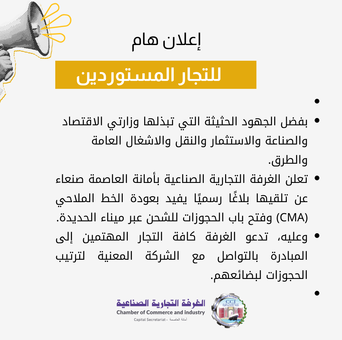 أعلنت الغرفة التجارية الصناعية بأمانة العاصمة صنعاء أنه، وبناءً على الجهود المتواصلة التي تبذلها وزارتي الاقتصاد والصناعة والاستثمار، والنقل والأشغال العامة، تلقت الغرفة بلاغًا رسميًا يُفيد بعودة الخط الملاحي (CMA) إلى العمل واستئناف نشاطه عبر ميناء الحديدة.