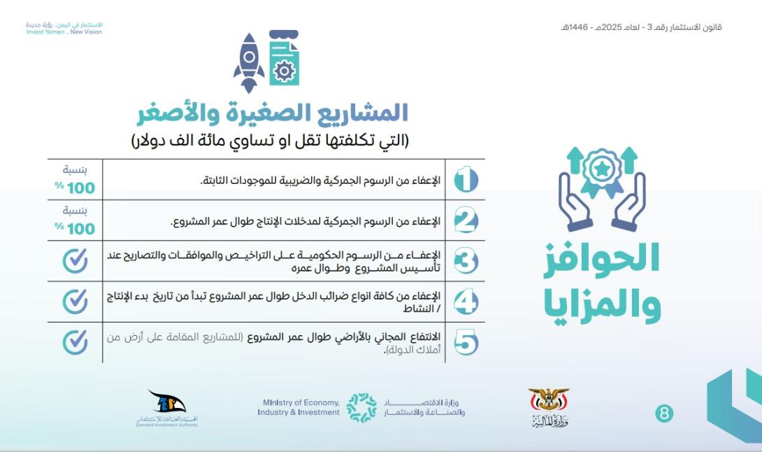 تُعد المشاريع الصغيرة والأصغر ركيزة أساسية في دعم الاقتصاد المحلي، وتحرص الحكومات على تقديم التسهيلات اللازمة لتمكينها من النمو والاستدامة. في هذا السياق، يتضمن قانون الاستثمار رقم 3 لعام 2025 مجموعة من الحوافز والمزايا التي تهدف إلى تشجيع هذه المشاريع، خاصة التي تقل تكلفتها أو تساوي 100 ألف دولار.